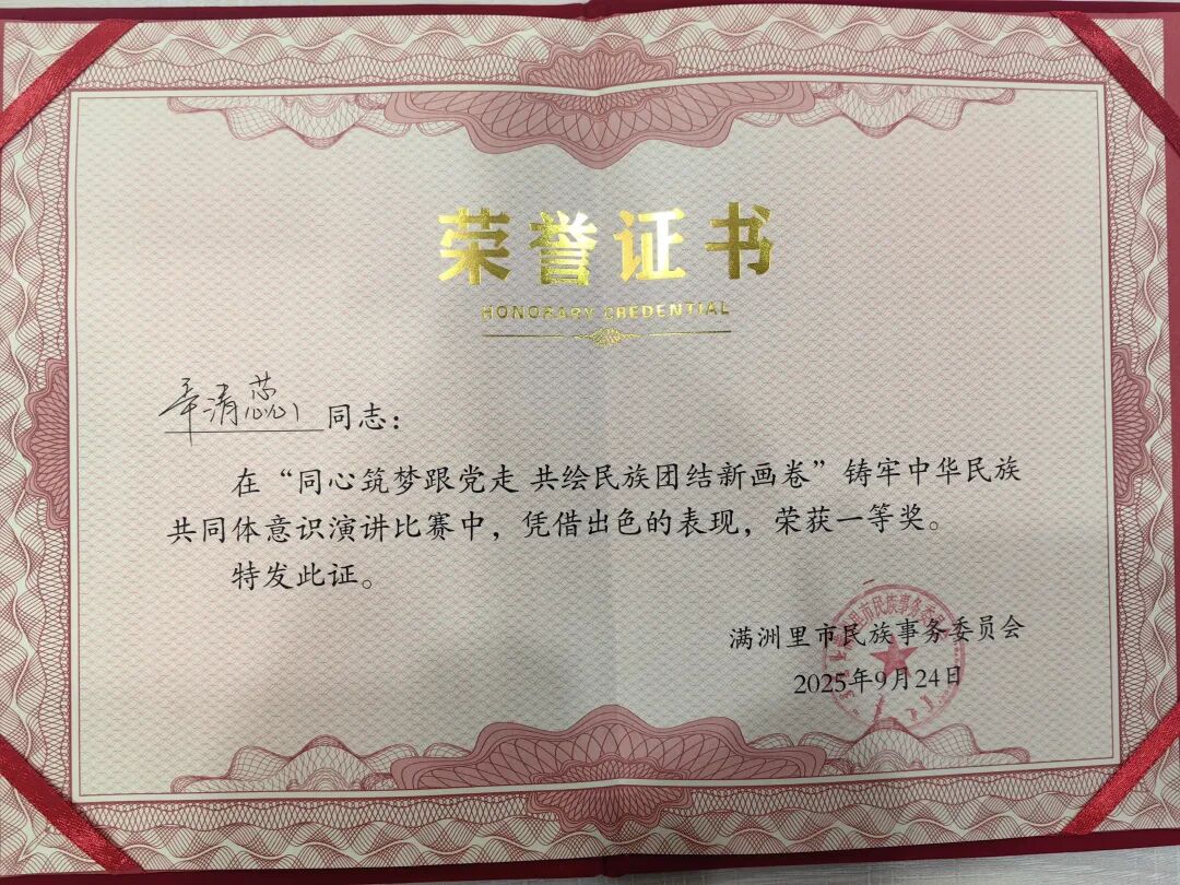 9月25日,由满洲里市民族事务委员会举办的“同心筑梦跟党走 共绘民族团结新画卷”铸牢中华民族共同体意识演讲比赛在怡园社区党群服务中心举行。满洲里市人民检察院辛清蕊荣获本次比赛一等奖。