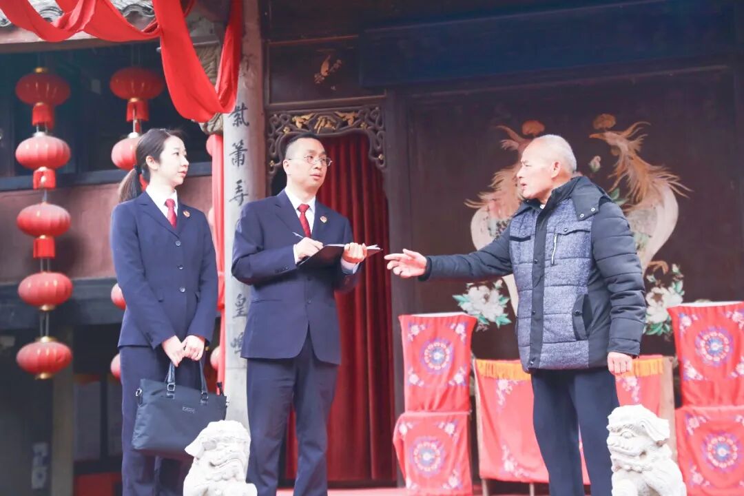 2026年1月,在女子越剧发源地浙江省嵊州市施家岙村,村民向嵊州市检察院检察官介绍古戏台的活化利用情况。