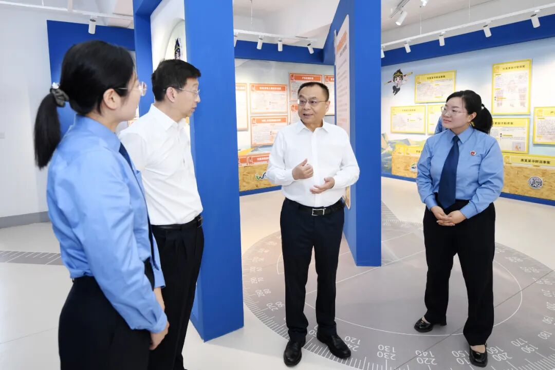 江苏省检察院党组书记、检察长赵铁实(右二)调研淮安市检察院“法话西游”体验馆之“知规守矩”法治实境课堂。
