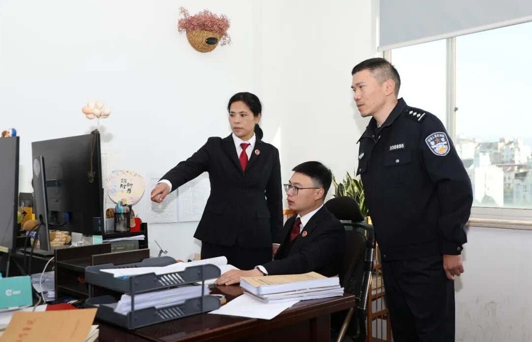 2025年4月,浙江省永嘉县检察院检察官吕赛燕(左)与同事对一起合同纠纷案进行审查。