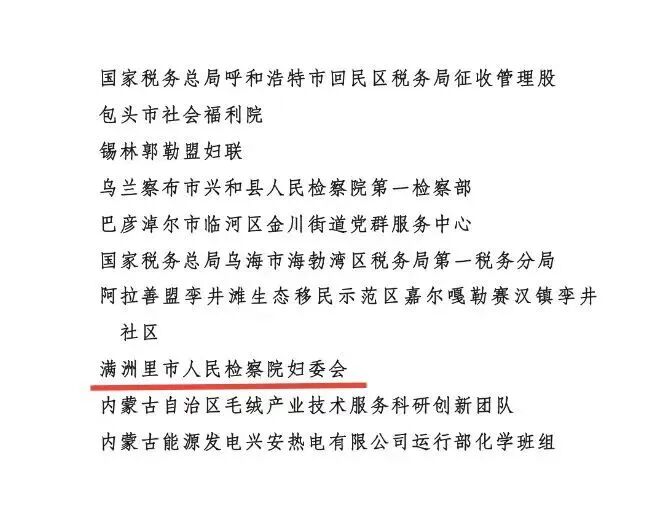 为表彰先进、树立榜样,激励广大妇女自尊自信、自立自强,奋进新征程、建功新时代,积极投身中国式现代化建设,全国妇联决定,授予王志勤等10人全国三八红旗手标兵称号,授予张晓欢等596人全国三八红旗手称号,授予首都医科大学附属北京妇产医院北京妇幼保健院等395个单位全国三八红旗集体称号,授予北京市城建园林金都公司绿化三大队天安门广场特养班组等599个单位全国巾帼文明岗称号,其中,内蒙古自治区满洲里市人民检察院妇委会荣获“全国三八红旗集体”。
